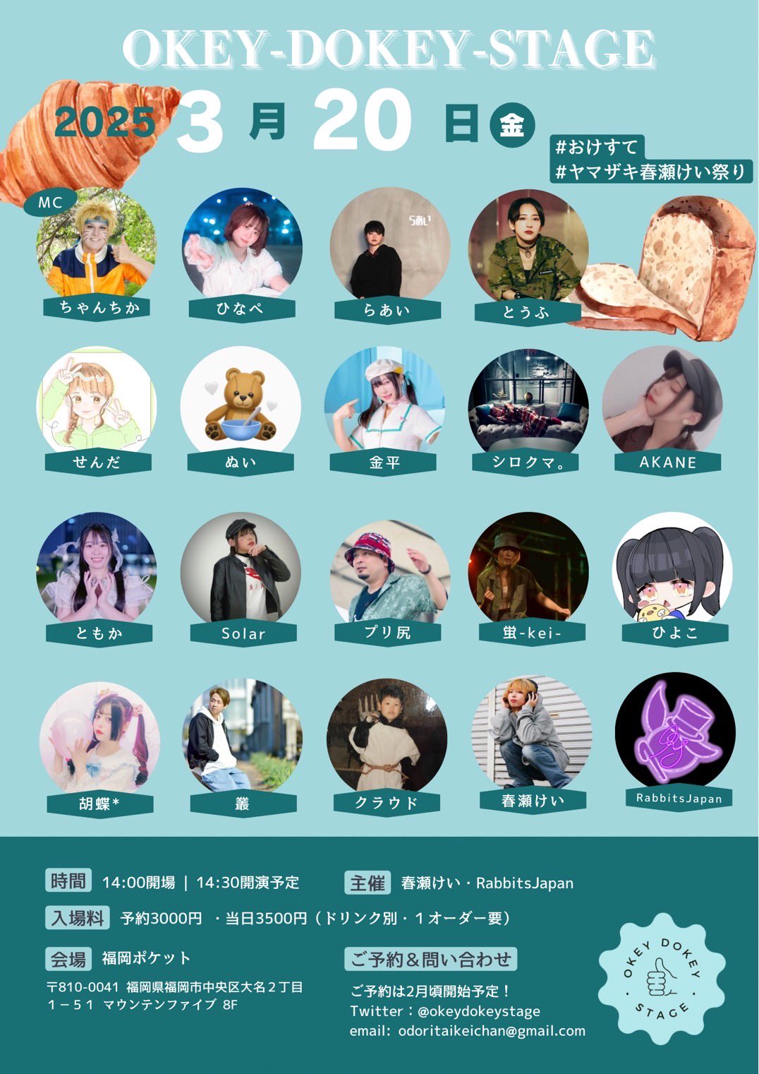 2026/3/20(金・祝) Okey-Dokey-Stage『#おけすて』 2026.03.20 2026/3/20(金・祝)OPEN 14:00 / START 14:30 出演 / Okey-Dokey-Stage ( Official X ) 【予約】¥3000+1Drink【当日】¥3500+1Drink Ticket 準備中 会場 福岡Pocket〒810-0041 福岡県福岡市中央区大名2丁目1−51 マウンテンファイブ8F